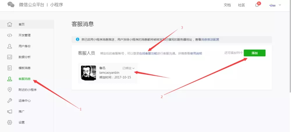 2.如果不是的話,需要登錄微信小程序后臺,選擇客服消息,添加客服人員