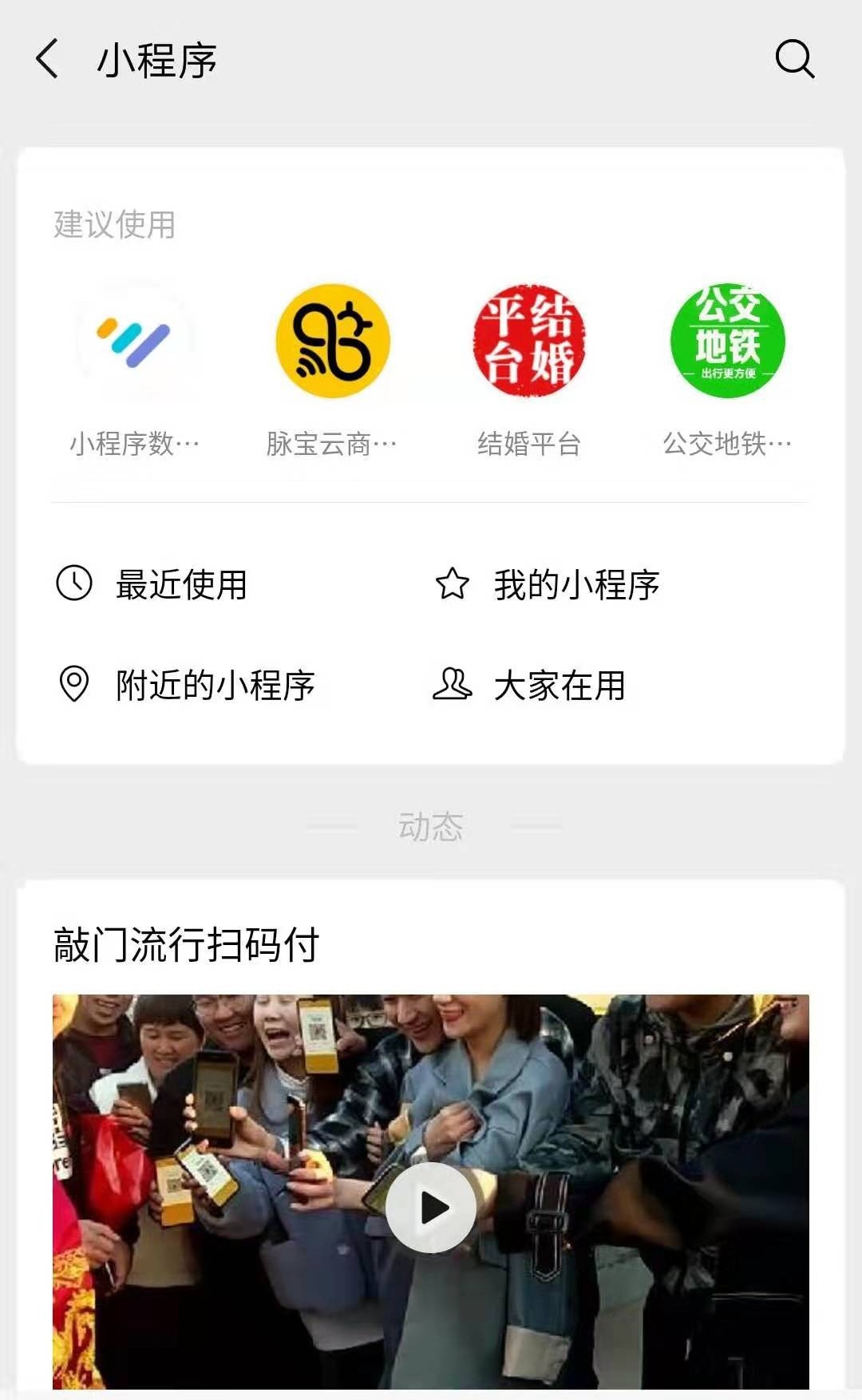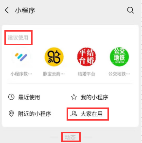 打開微信-發現-小程序,進入小程序界面,你會看到新增了“建議使用”、“大家在用”、“動態”等三大欄目。