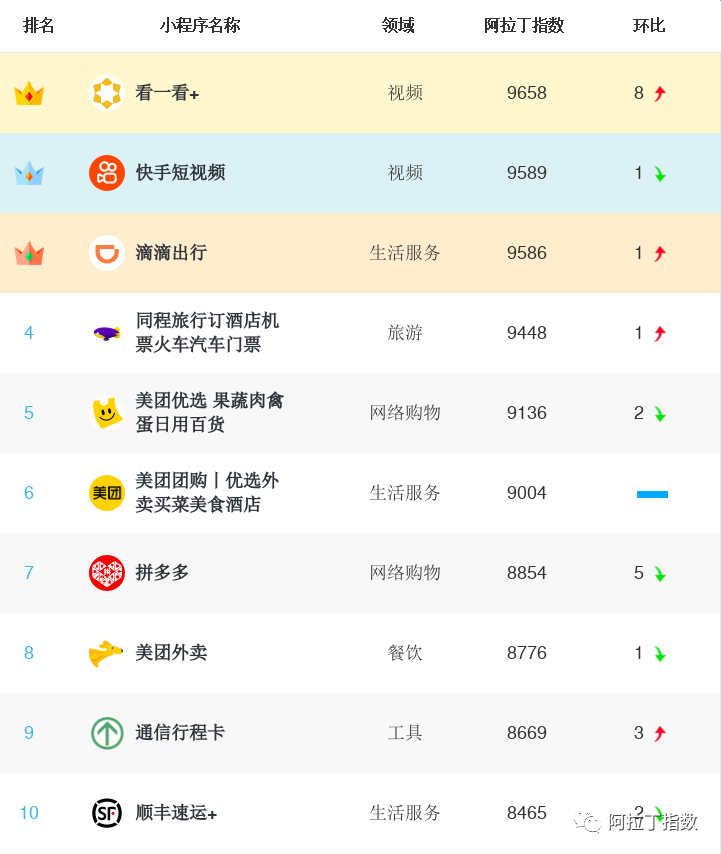 由阿拉丁研究院出品的全網微信小程序榜單新鮮出爐,最新看點就是在TOP10榜單中看一看+小程序登頂榜首,而長期占據前三甲的拼多多小程序本月僅排名第7,一起來看看吧!