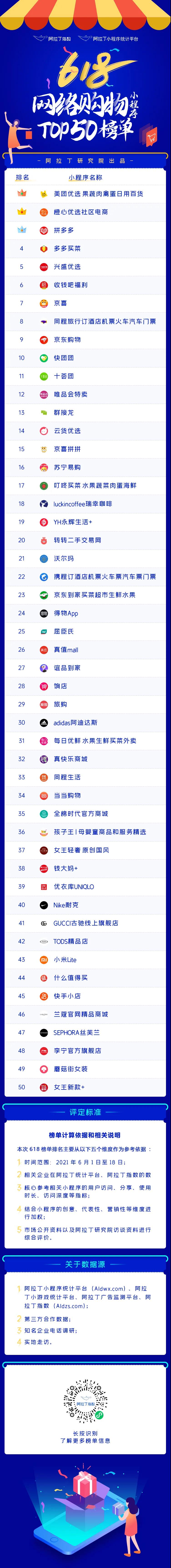 昨天,由阿拉丁指數和阿拉丁統計平臺統計的“618網絡購物小程序TOP50榜單”正式發布。