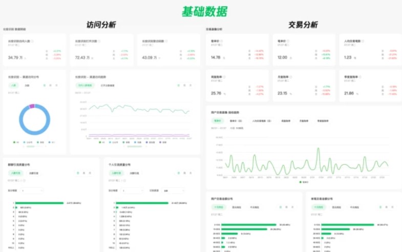 1、基礎(chǔ)功能:官方提供的小程序統(tǒng)計(jì)數(shù)據(jù)服務(wù),無(wú)需進(jìn)行數(shù)據(jù)接入,即可查看小程序的訪問(wèn)和支付等統(tǒng)計(jì)結(jié)果數(shù)據(jù),便于快速掌握小程序整體的運(yùn)轉(zhuǎn)情況。