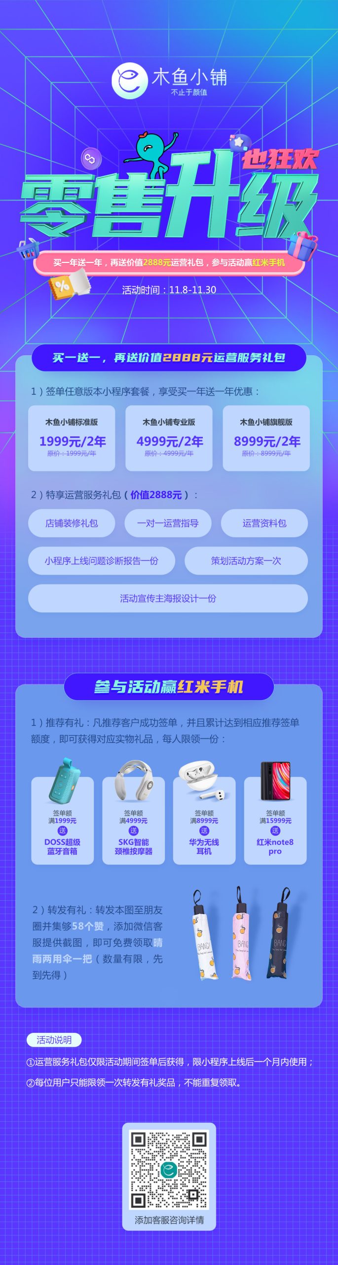11月8日,國內首家高端新零售小程序服務商木魚小鋪推出“零售升級也狂歡”雙十一活動,新零售商城小程序買一年送一年,再送價值2888元運營禮包,推薦轉發送實物大禮等活動,真優惠、無套路,助力更多實體商家零售升級。