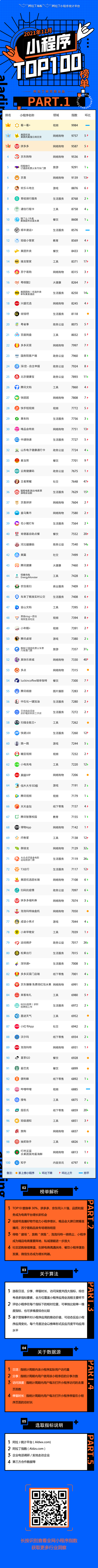 阿拉丁指數:2021年11月小程序TOP100榜單 行業動態 作者: admin 2021年12月9日 9:30 2,237 瀏覽 評論已經關閉 阿拉丁指數剛剛發布了11月份小程序TOP100榜單。根據阿拉丁指數統計,11月份小程序TOP100更替率9%,看一看繼續領跑,拼多多、京東進入前十;唯品會、蘇寧易購發力視頻號直播,喜茶GO、星巴克新晉百強。 從類型結構來看,網絡購物、生活服務、工具類三大類型小程序累計上榜55個,較上月增加1個;其中網絡購物小程序增加2個,工具小程序增加2個,餐飲小程序增加2個。 2021年11月小程序TOP100完整榜單 文章標簽: 小程序榜單 阿拉丁指數