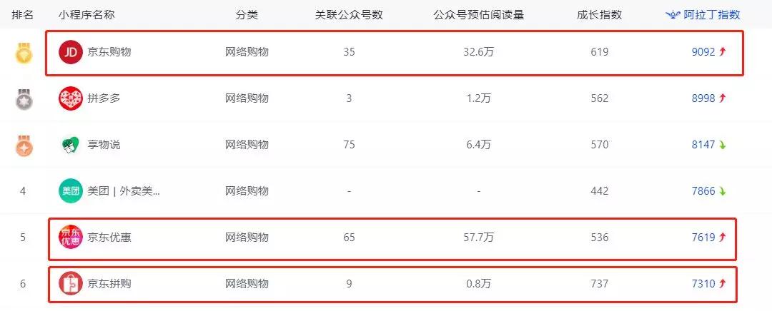 據最新的阿拉丁指數日榜顯示,在網絡購物類目下前6的小程序,京東就占了3個,分別是京東購物、京東優惠、和京東拼購。