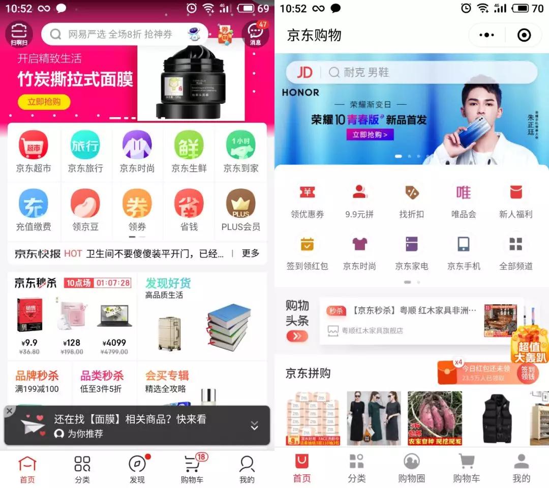 從下面的對比圖你會發現,「京東購物」小程序的界面和京東APP十分相似,功能上更是囊括了后者幾乎所有的功能,秒殺、拼購、優惠、簽到這些APP的玩法你都能在小程序端找到,它針對的是京東的整體用戶。